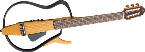 The Yamaha SLG110N Silent Acoustic-Electric Guitar lets you practice with headphones, yet enjoy the realistic sounds of an acoustic instrument. The nylon-stringed Yamaha silent guitar features a lightweight maple body, mahogany neck, rosewood fingerboard, and breaks down quickly to fit into included gig bag for easy transport. In comparison to a traditional classical guitar, the SLG110N's slimmer neck and lower action allow the player to develop a quicker and more aggressive style. The silent acoustic-electric guitar has mini-stereo inputs for plugging in a MP3 or CD player for play-along. The Yamaha acoustic-electric guitar interfaces well with acoustic-effects processors, P.A.s and amps. Also includes a durable gig bag.Silent design makes it perfect for home use or practiceCompared with a normal acoustic guitar the Silent Guitar "acoustically" produces only 1/100th the amount of sound energy and 1/10th the amount of sound volume (tested in-house). Such excellent silent characteristics make it great for playing anytime or anywhere.Built-in DSP effect adds the richness of reverbElectronics include piezo in-bridge B-Band (EMF) pickups and an internal DSP. The digital effects taken from the class-leading SPX studio effects and industry-standard digital mixing consoles developed by Yamaha Commercial Audio, audiophile quality and the ambience of a warm, small room or luxurious large hall are with you wherever you are. 4 effects are avavailable; Reverb1, Reverb2, Chorus and Echo. AUX IN lets you play along with your favorite recordingsConnect a CD or cassette player, etc. to the AUX IN jack and play along with your favorite recordings. This feature is a great way to improve your playing quickly. An AUX volume control offers greater control over sound balance. Detachable frame offers comfort and easy transport The Silent Guitar's unique design offers excellent comfort and support even when played while seated. A cutaway design provides full access to the upper frets.