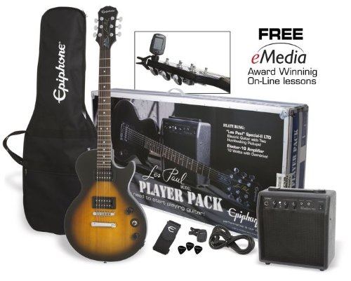 The Epiphone Les Paul Electric Guitar Player Pack is a great way to save time and jump start a career in music. It includes an Epiphone Les Paul Special II guitar, Electar-10 amp with overdrive, gig bag, pinch-on tuner, strap, cable, guitar picks and free eMedia guitar lessons on-line.Les Paul Special IIEpiphone's number one selling model LP Special II is a great way for beginners to get started on guitar while getting the feel and tone of a Les Paul. Seasoned pros also love the Special II because it's a great-sounding workhorse of a guitar that allows them to leave their more expensive axes at home.Electar-10 AmplifierThe Electar-10 amp is a 10-watt amp with overdrive. It features 2-band EQ for tone shaping. There are also inputs for headphones and connecting a music source such as an MP3 or CD player.