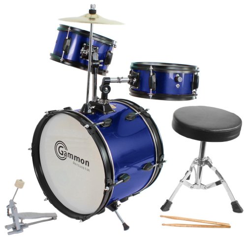 This amazing Metallic Blue brand new junior drum set comes with everything you need to start playing included - 16" Bass Drum, 2 Mounted Toms, Bass Drum Pedal , 1 Mounted Cymbal, Drummer's Throne (stool), Pair of Sticks & Drum Key. Some assembly is required and instructions are included. This will make a perfect gift for any aspiring young musician and has been a customer favorite for years! We are an authorized Gammon retailer. Comes in one easy to wrap box! Gammon is the leader in affordable percussion products.