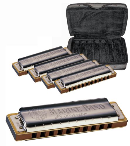 This special pack contains a C, G, A, D, and E key Hohner 1896/20 Marine Band harmonicas in a padded case. The harmonicas are probably the most played harmonicas in the world due to their excellent sound and ease of playing. Break them in gently and they'll produce those flatted thirds fifths and sevenths that are the heart of great blues harp. They are 10-hole diatonic with a pearwood comb and bolted on covers. The case holds 7, so there's room for your extras. It's padded on the outside, black and plush on the inside. It uses both a zipper and a hook-and-loop fastener to keep them all inside when you travel. It also has a handle for easy carrying..