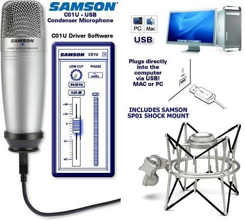 Samson C01U Studio Condenser USB MicrophoneSamson SP01 Shock Mount for the C01 and C03 Condenser MicrophonesThe C01U USB Studio Condenser Mic is the first affordable studio condenser mic with a direct USB output. It features cardioid pick up pattern ensuring pristine studio quality recordings. The C01U works perfectly on any computer, Mac or PC, and with any DAW software program. It immediately solves a huge problem for users of many laptops, many of which have no other input method for audio devices.Large internal shock mounted 19mm DiaphragmHeavy Gauge Mesh GrillSee More Details >>