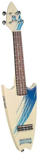 UE-30N Mahalo Electric Ukulele with Bag : Once again, Mahalo scoops the Music Industry! The new Mahalo UE-30N is not only a cutting-edge solid-body electric ukulele—but it’s made in the shape of a surfboard! With its unique shape and glossy white finish with blue surf-style graphics, this amazing new uke will certainly turn heads and bring everyone’s attention right to your store display! A powerful piezo pickup faithfully amplifies the natural, mellow tones to unheard-of volumes while the guitar-style metal tuners tune easily and precisely. A padded gig bag is included at no extra cost.